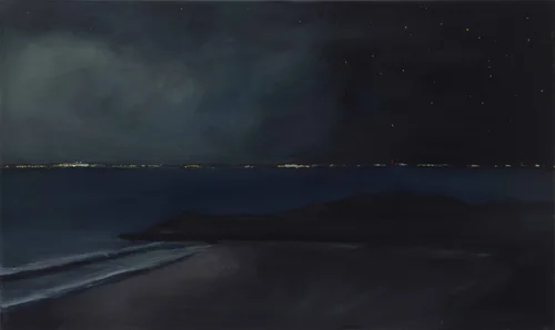 In the Halloween paintings, the internal world of fantasy and fluid identity is played out in a public space. The costumed figures create an interruption in the otherwise seamless world of the real, inviting us to temporarily suspend disbelief.
